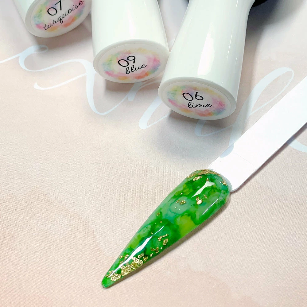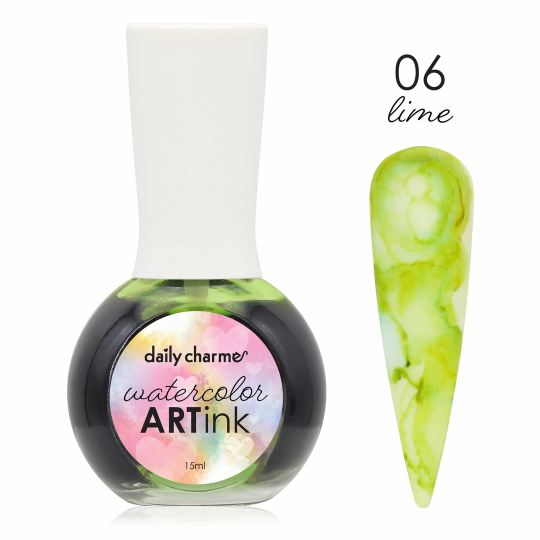 Daily Charme Art Ink is perfect for creating artistic watercolor style nail designs and is specially formulated to be fast drying and highly pigmented. The lime art ink is a great vintage tone muted lime green. Great when mixed with blue and turquoise to create an emerald jade nail design!