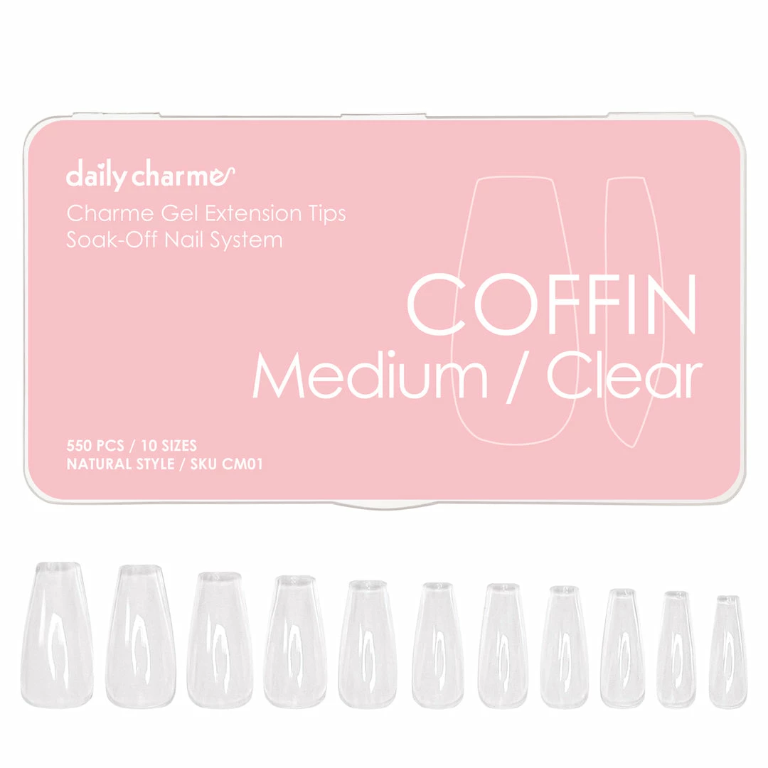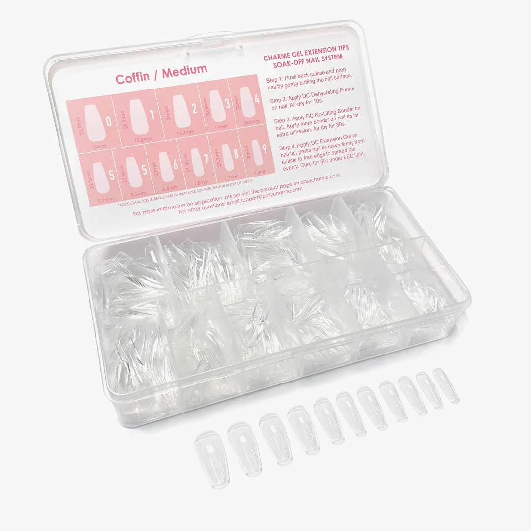 Tips: We recommend sealing your extensions with gel top coat to add strength and to prevent fogging of the nail tip. For longer length extensions, we recommend applying Daily Charme 5-in-1 Strengthening Gel or another builder gel to create a stronger nail.