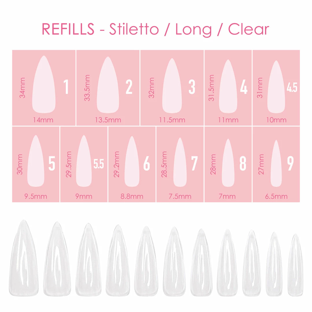 Refill packs and additional sizes for Charme Gel Nail Extension Tip boxes. Each pack includes 50 pieces of same sized nail tips, these are great for stocking up on popular sizes that tend to run out faster!