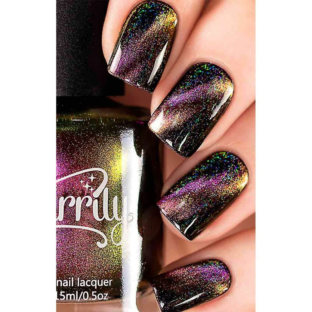 Nova Beam is a beautiful holographic magnetic color changing multi chrome nail polish used with a magnet to create 3D designs. It changes from several different colors including red, gold, and green depending on the viewing angle.