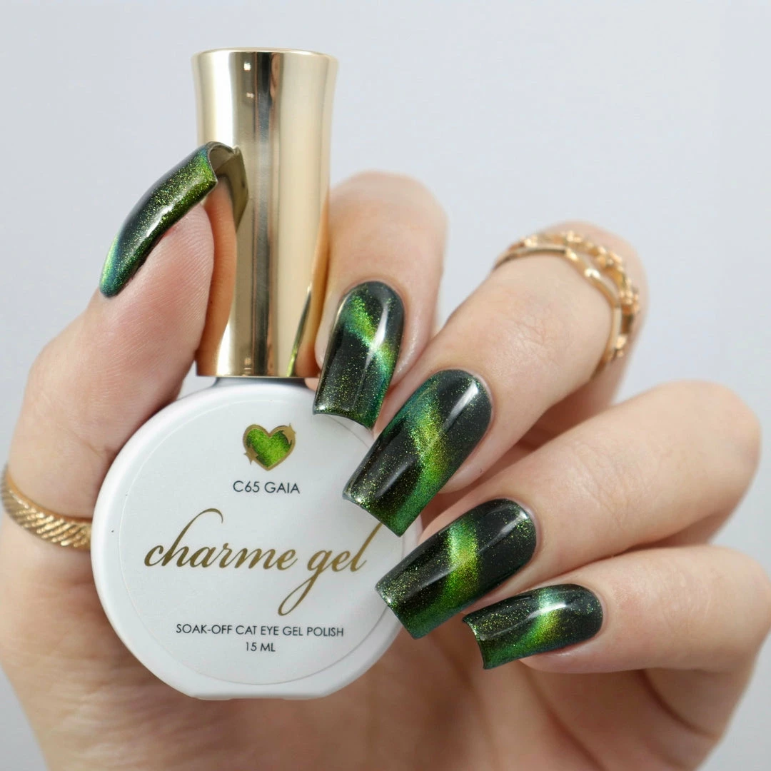 C65 Gaia – A beautiful mixture of the unique shine of cat eye with mesmerizing chameleon color shift. This lime green chameleon cat eye gel shifts to a pale golden shimmer, use it with a magnetic wand to create your own unique color shifting cat eye designs. Layer this gel over black base for a more vibrant color, it can also be worn alone without using magnetic wand as a beautiful green and gold chameleon metallic shimmer. Cat Eye gels are especially perfect for creating a sparkling background for galaxy nails!