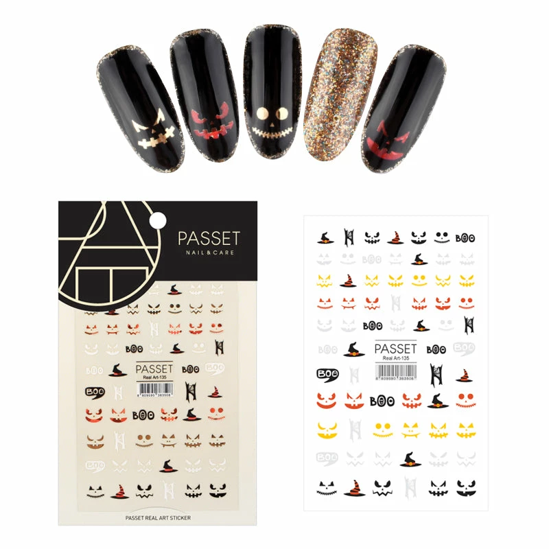 Wear Jack O Lanterns on your nails for Halloween with this sheet of Halloween themed sticker. Prints include metallic, and holographic faces fo Jack O Lanterns, Boo and witch’s hat.