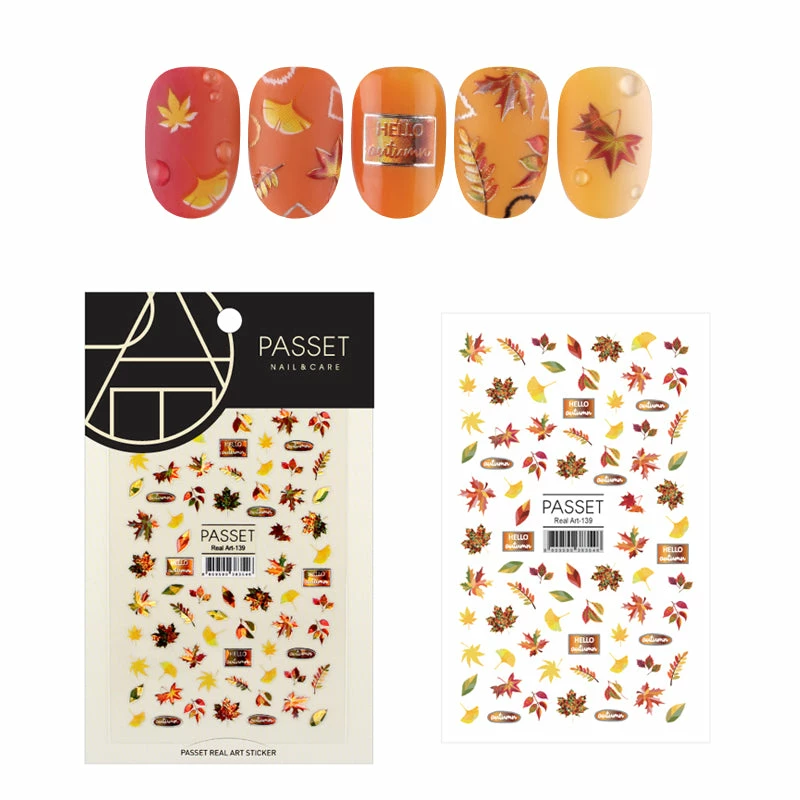 Decorate your nails with autumn leaves! This sheet of sticker includes prints of various fall foliages such as gingko leaf and maple leaf in golden yellow or holographic red colors. This sticker is perfect for fall nails and Thanksgiving nails.