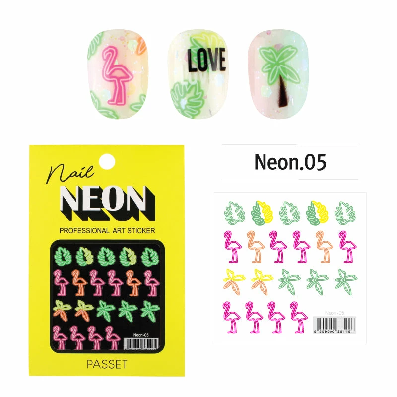 Watch your nail designs light up under UV blacklight with these fun and bright neon stickers! This sticker includes neon outlines of flamingos, monstera leaves and palm tree leaves, it’s perfect for summer tropical nails and plant parent nails.