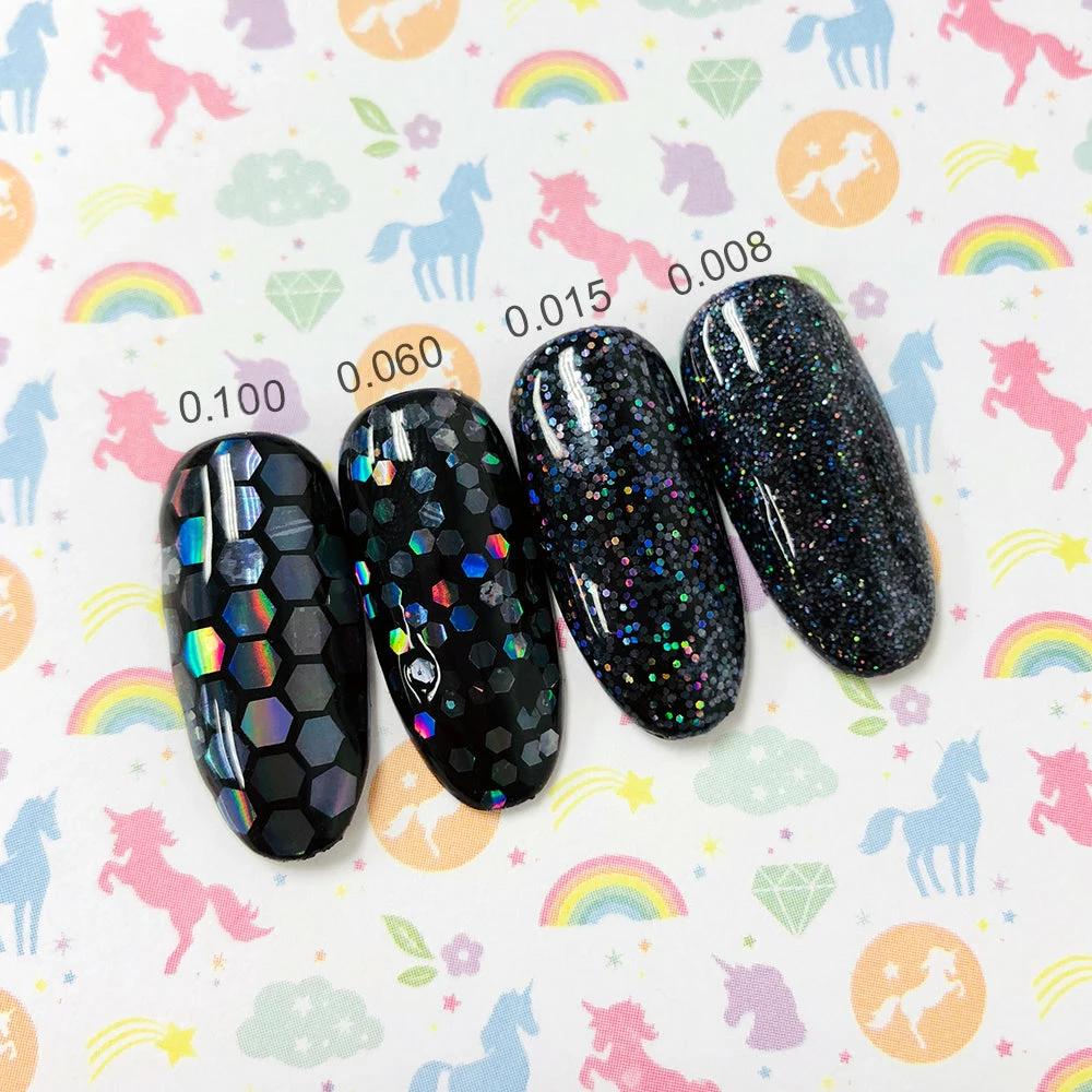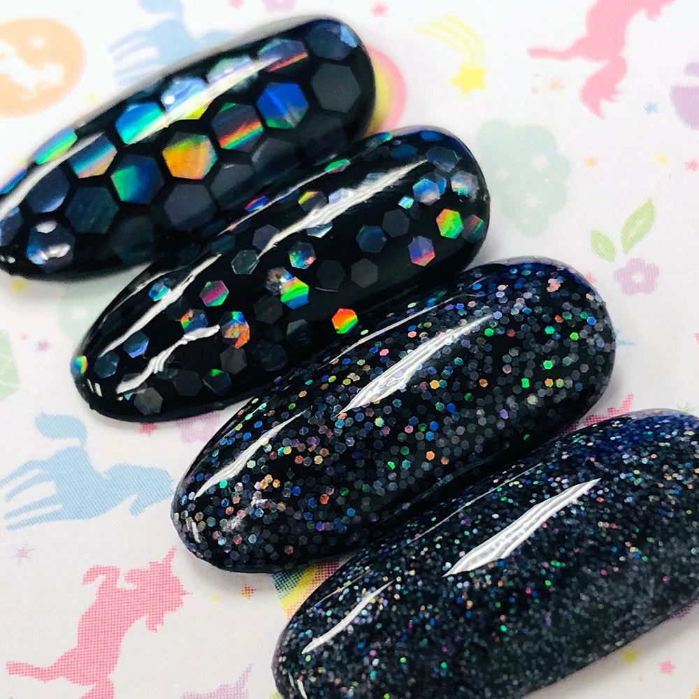 Clear Holo Hex Glitter is both transparent and holographic! These fine quality glitters are fun, versatile and super easy to use. Create a sugar sprinkled look by dusting over wet gel or burnish it over tacky gels to get a holographic effect over any base colors.