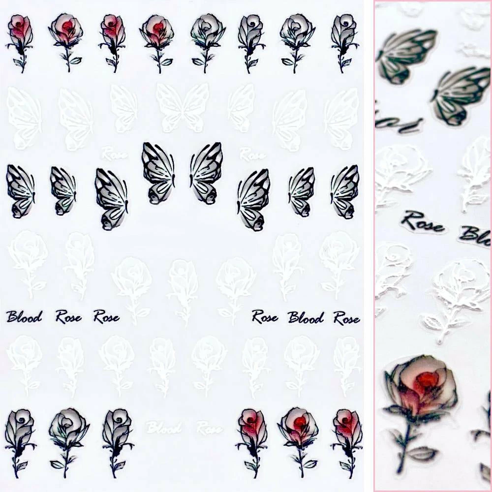 Decorate your nails with these gothic style roses and butterflies. Designs include black and white roses and butterfly wings, some of the roses comes with a blushing red center. This sticker is perfect for Valentine’s Day nails, wedding nails and gothic Halloween nails!