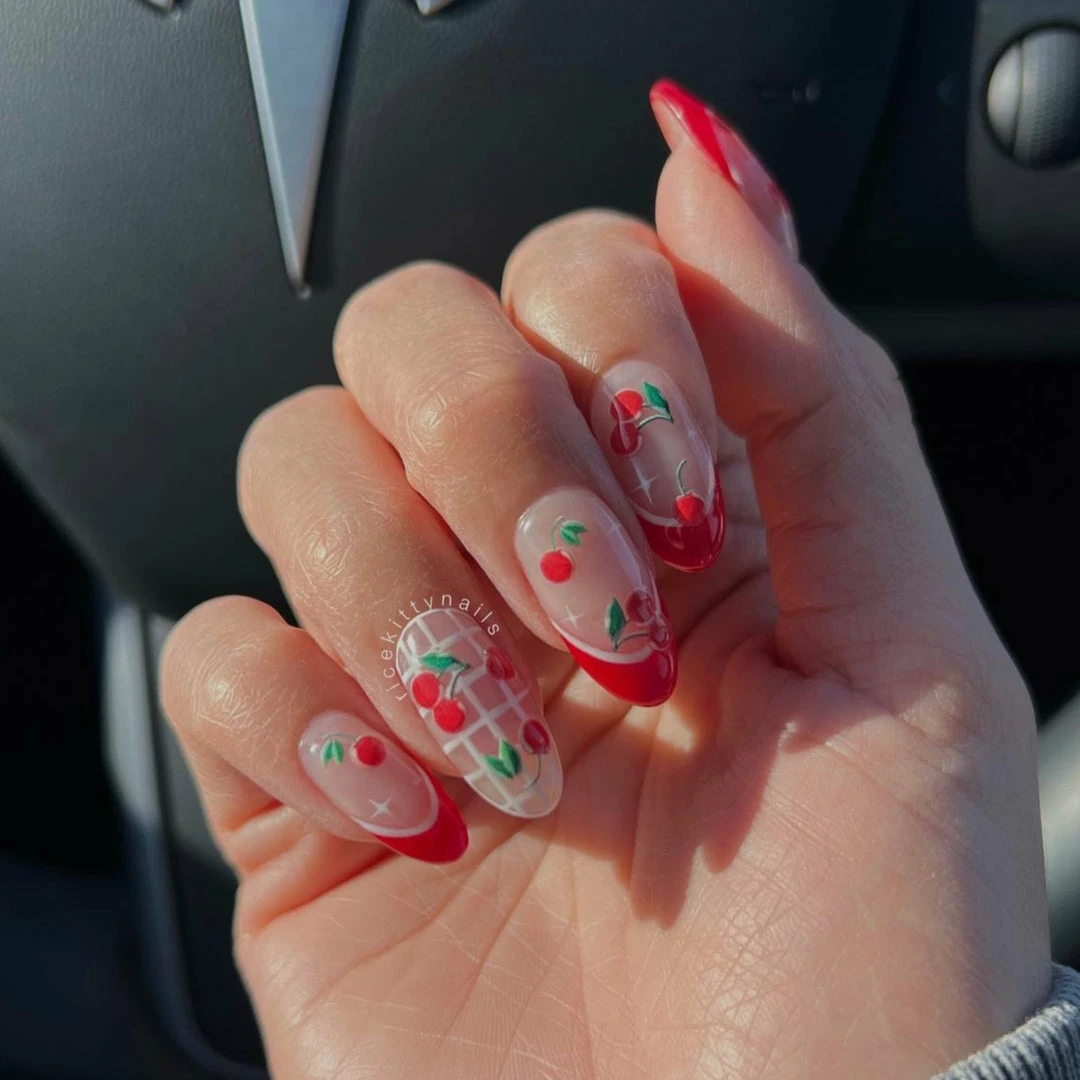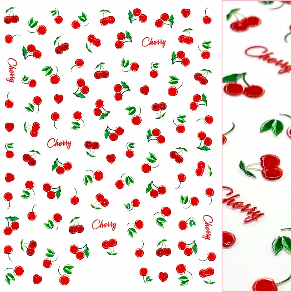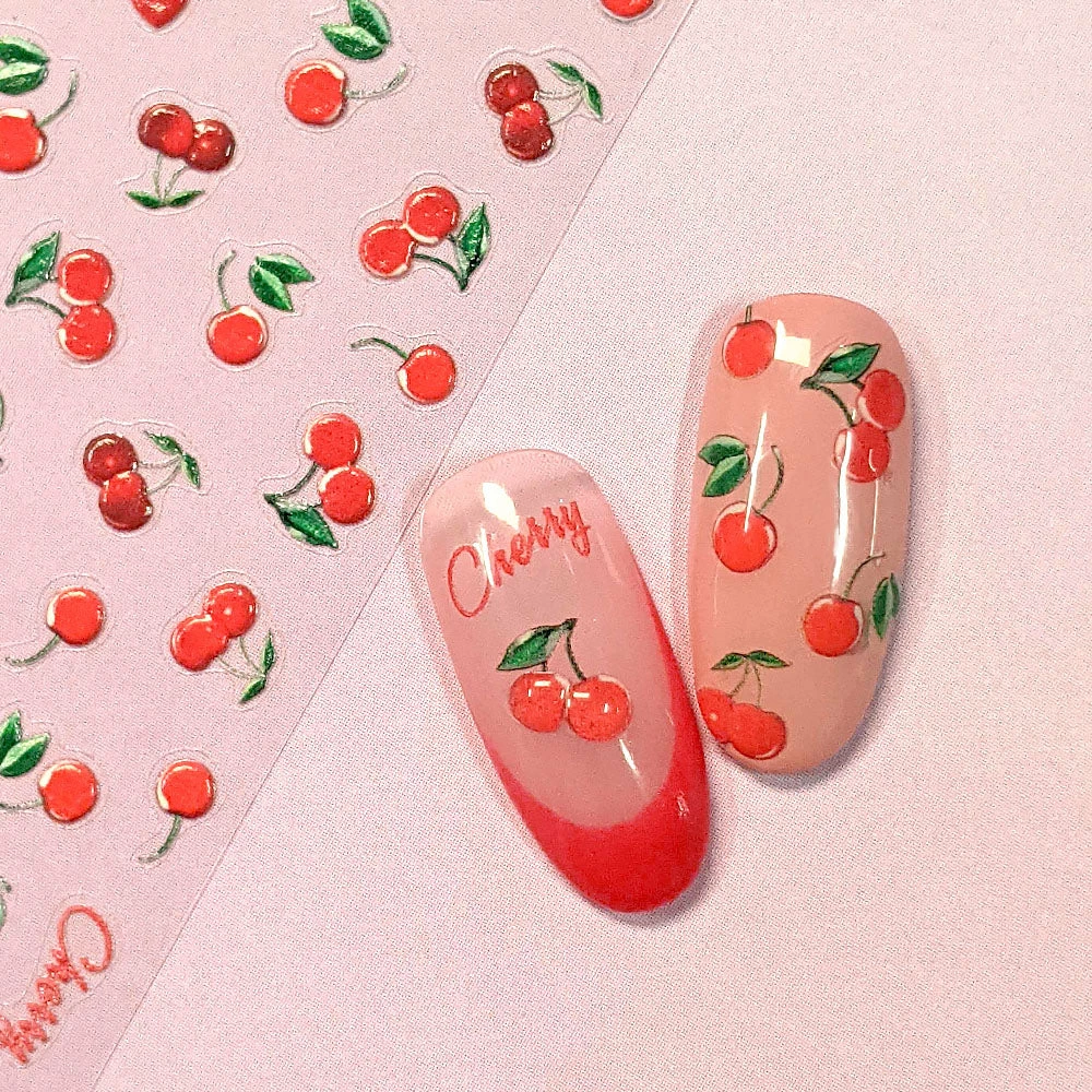 Decorate your nails with these super adorable red juicy cherries, a must have sticker design for Spring and Summer fruit nail art!