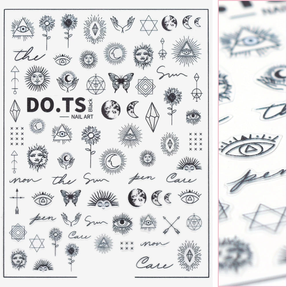 Wear mystical elements on your nails to bring you good vibes and energy! This sheet of sticker includes black outline prints of evil eye, sparkling crystals, hands, moon, sun, sunflowers and abstract geometric shapes.