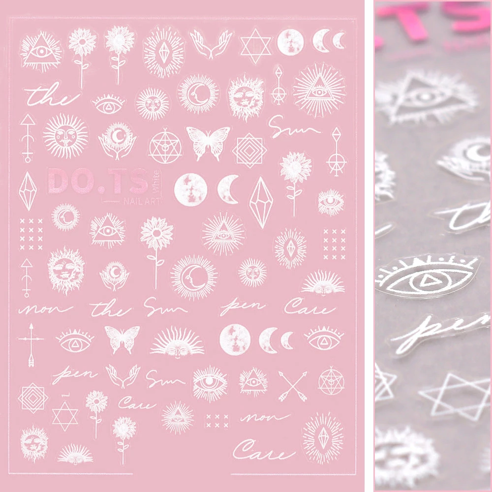 Wear mystical elements on your nails to bring you good vibes and energy! This sheet of sticker includes white outline prints of evil eye, sparkling crystals, hands, moon, sun, sunflowers and abstract geometric shapes.