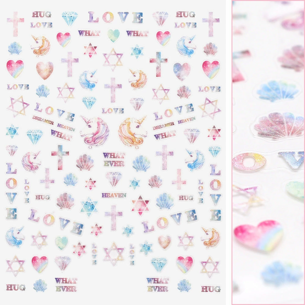 A cute rainbow pastel sticker filled with hearts and unicorns, use it to decorate your magical unicorn nails!