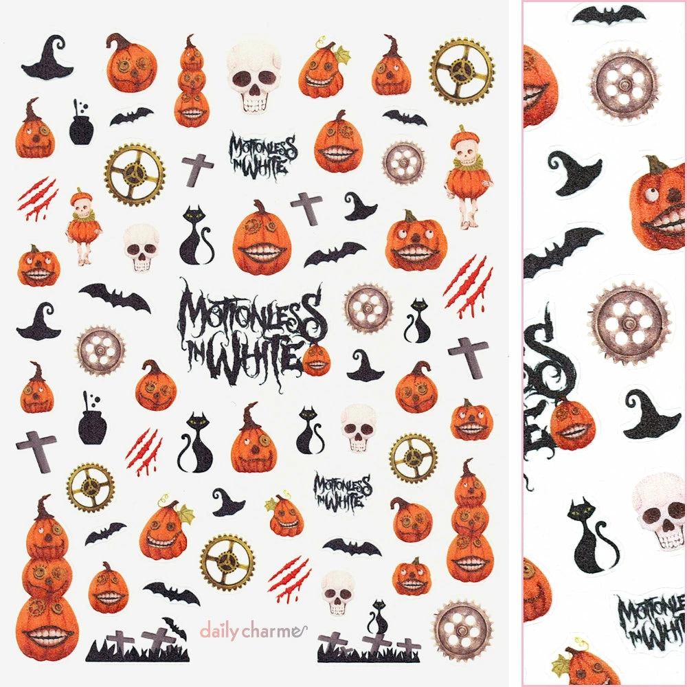 Get your Halloween nails ready for spooky season with haunting creatures and creepy crawlies! This Creepy Faces sticker include prints such as scary jack-o-lanterns, witch’s hats, cauldrons, bats, bloody claw marks, graveyard, black cats, skulls and gears.