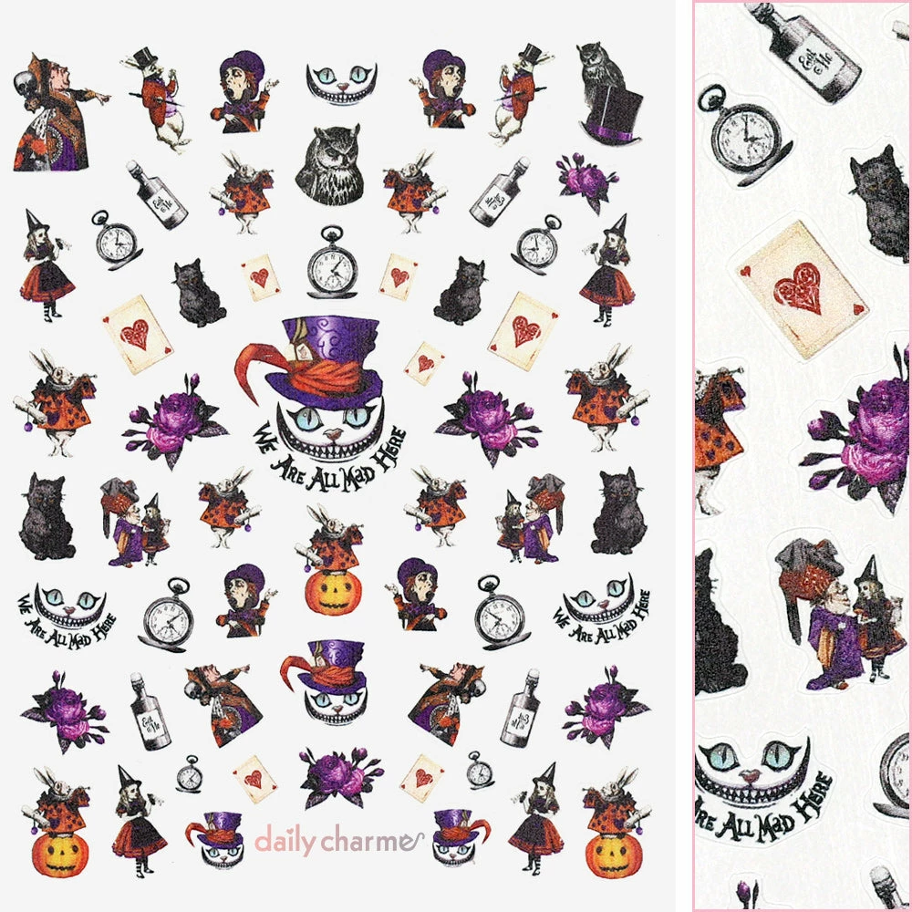 Get your Halloween nails ready for spooky season with haunting creatures and creepy crawlies! This Dark Wonderland sticker include Halloween themed characters and elements from Alice in Wonderland such as Alice, Cheshire Cat, Mad Hatter, White Rabbit and more!
