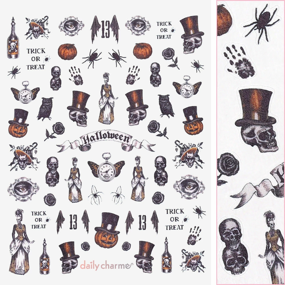 Get your Halloween nails ready for spooky season with haunting creatures and creepy crawlies! This Victorian Halloween sticker include prints such as pumpkins, spiders, bats, skeletons, skulls, black roses, owls, hand prints in vintage woodblock art style.