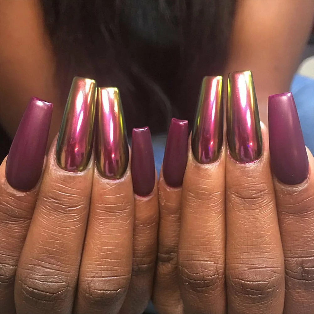 Use our Chameleon Color Shifting Chrome Powder to create beautiful color shifting chrome nails! Aphrodite Pink will shift between pink, gold and green.