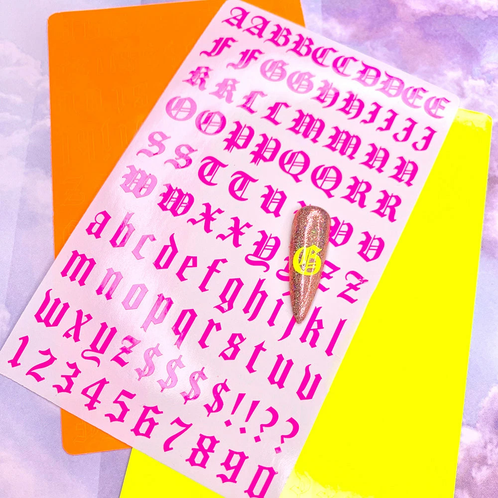 Our best selling Blackletter Alphabet vinyl stickers are now available in neon colors! This set contains one sheet each of three eye-catching electric colors: Neon Yellow, Neon Orange and Neon Pink, use these to add a pop of color to your summer nails.