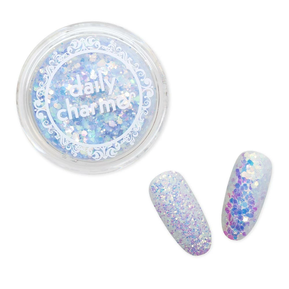 Color Changing Iridescent Glitters in Blue. These glitters look like transparent AB rainbow iridescent glitters indoors and changes to a blue rainbow color outside under the sun! Super cute and fun glitters for your nails. Get 2 different looks from day to night. Easy to use, just sprinkle them over adhesive gels like the Daily Charme 5-in-1 Strengthening Gel and cure. These glitters change color more vibrantly without a gel topcoat.