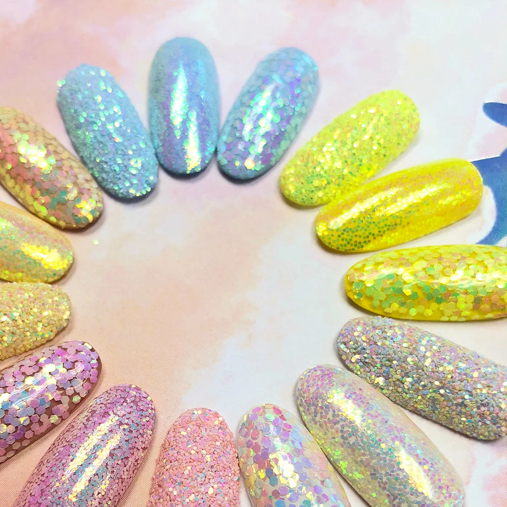 Pastel Iridescent Glitters – Key Lime Pie is a super fun pastel neon yellow glitter. These fine quality glitters are bright, colorful, sparkly and super easy to use. Create a sugar sprinkled look or try burnishing it over tacky gels. Perfect for a pop of color and a great addition to other neon bright or jelly nail art looks.